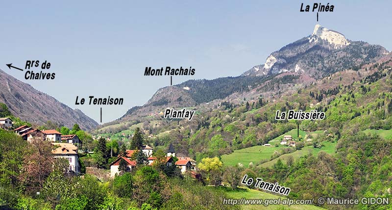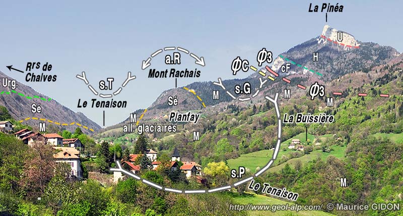Au nord des villages de Pomaray et de Planfay la largeur des affleurements miocènes se réduit , du fait de ce que le Sénonien revient au jour, à mi distance des deux flancs du synclinal de Proveysieux, à la faveur d'un repli secondaire, l'anticlinal du Mont Rachais. L'axe de ce pli plonge vers le sud et les calcaires sénoniens de sa voûte déterminent un petit mont* secondaire, qui accroît son altitude vers le nord ; à l'est de ce pli le Tertiaire (marnes oligocènes et molasses miocènes) est conservé dans un synclinal de Girieux qui est au contraire assez ouvert et dont la route forestière qui permet de gagner depuis Planfay la prairie de Girieux donne une coupe oblique.