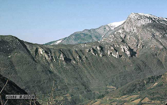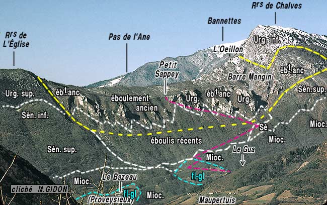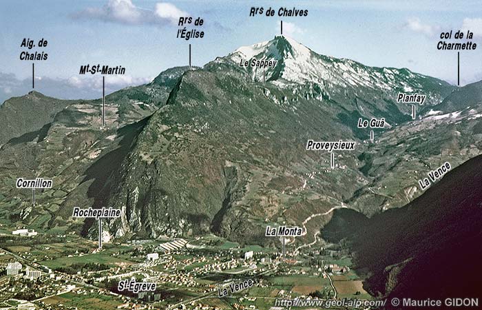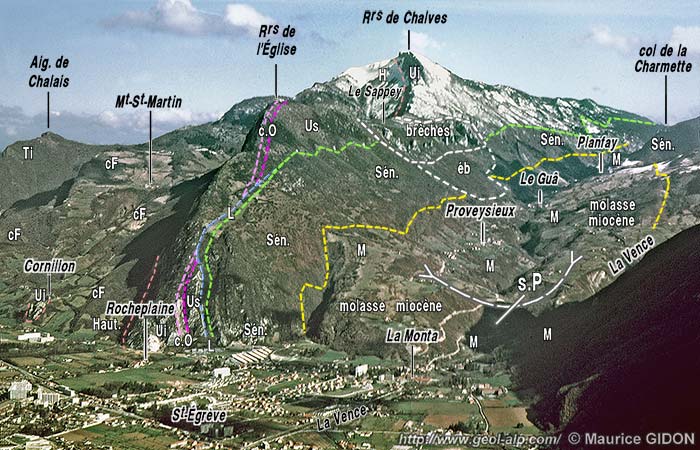 ![]() L'Aiguille de Quaix, versant sud-est , vue du sud, depuis l'arête nord du Néron (peu au dessus du lieu-dit "Les Batteries"). s.P = synclinal de Proveysieux ; Ø3 = chevauchement de la Chartreuse orientale; a.L = anticlinal de Leuilly ; f.bR = faille NNE-SSW du Bois Ronzier ; f.pQ = faille N-S des Prés de Quaix ; d.S = décrochement des Salanches. L'astérisque rouge indique la localisation de la carrière de meules (voir en fin de page). La surface de colmatage du sommet des alluvions fluvio-glaciaires d'obturation du vallon de Proveysieux (tirets bleus) est celle dont l'altitude est voisine de 650 m : elle correspond sans doute au stade 3 du retrait glaciaire würmien. |