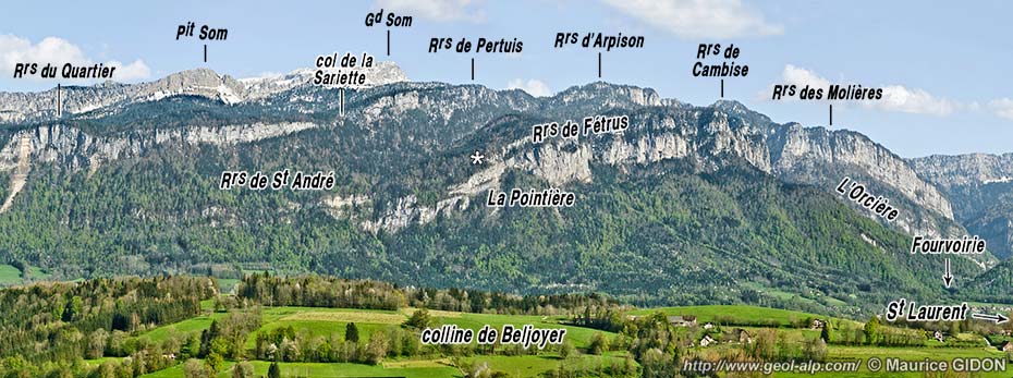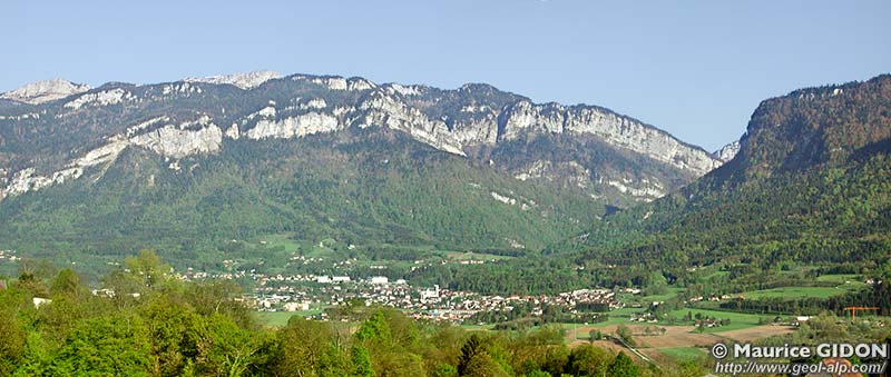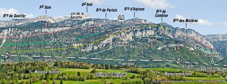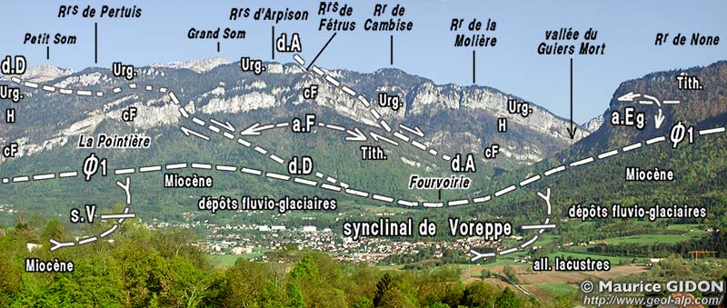 ![]() Le site de Saint-Laurent-du-Pont, vu du sud-ouest, depuis le hameau de Grassetière (Miribel) La vue est prise presque dans l'axe du trans-anticlinal de Fourvoirie (a.F), que tranche en biais le chevauchement de la Chartreuse occidentale (Ø1) ; a.Eg = charnière de l'anticlinal des Égaux (crochon du chevauchement). d.D = extrémité méridionale du décrochement du Pas Dinay (voir la page "Sermes") : il vient se connecter à la surface de chevauchement au débouché du défilé de Fourvoirie ; d.A = décrochement d'Arpison (les autres failles de décrochement qui affectent la voûte de l'anticlinal de Fourvoirie n'ont pas été indiquées, en raison de leur rejet, trop peu important pour être mis en évidence sur ce cliché) (suite vers la droite de ce panorama, pris du même point, à la page "Charmille") |