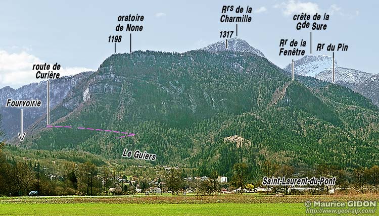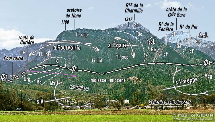 Au sud du Guiers l'obliquité de la surface topographique par rapport aux plis a pour effet ne ne plus laisser voir que le Jurassique du cœur de l'anticlinal de Fourvoirie : l'érosion tranche sa charnière dans les abrupts qui tombent de l'Oratoire de None sur Fourvoirie (mais la route de Curière ne la traverse pas car son tracé passe trop bas dans le versant).