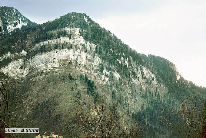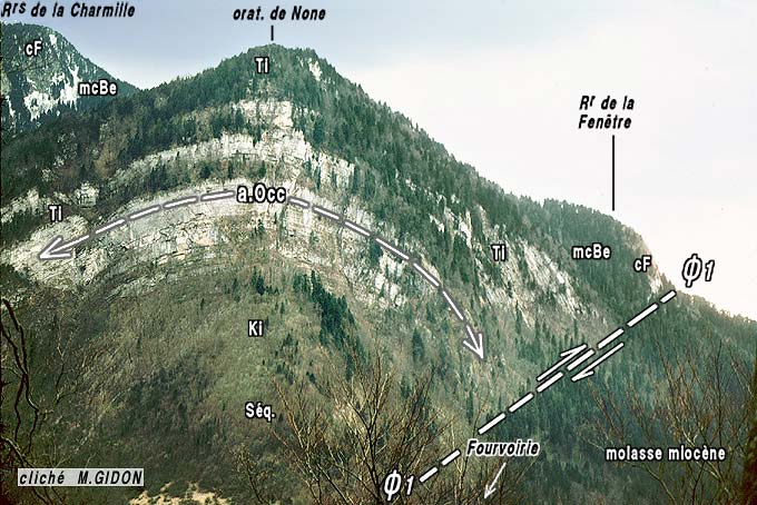 Les escarpement boisés qui tombent du côté NW de cette crête de None montrent un bel enroulement des couches du flanc nord-ouest de l'anticlinal qui plongent en dalles structurales avant de se faire trancher orthogonalement par le chevauchement. Elles se complètent plus au sud par les couches du Crétacé inférieur, notamment les calcaires du Fontanil des Rochers de La Fenêtre et du Pin qui s'y redressent à la verticale.
