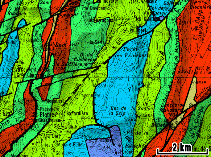 - Au nord du lit du Guiers (voir cliché ci-dessus) son tracé, orienté NNE-SSW, semble suivre simplement, à l'ouest de Patassière, la limite entre calcaires du Fontanil et marnes de Narbonne et irait ainsi s'amortir dans les pentes boisées orientales de la Roche Cla, en y rompant le flanc ouest de l'anticlinal de l'Écoutoux. Mais il s'agit de déductions mal étayées dans le détail en raison du couvert forestier qui limite beaucoup l'observation des affleurements. - Au sud (voir page Saint-Hugues et cliché ci-après) son tracé n'est pas moins incertain ; il semble suivre le pied des pentes du Bois du Grand Logis, pour se poursuivre en direction du nord-ouest du col de Porte Il est plausible qu'il s'y poursuive par le décrochement du Montfromage (voir la page "Pinéa") et que, par son intermédiaire se réalise, vers lui comme vers le décrochement de l'Oursière, le tranfert d'une partie du rejet dextre de celui du décrochement du col de l'Alpe. |