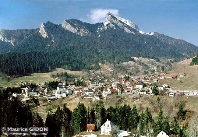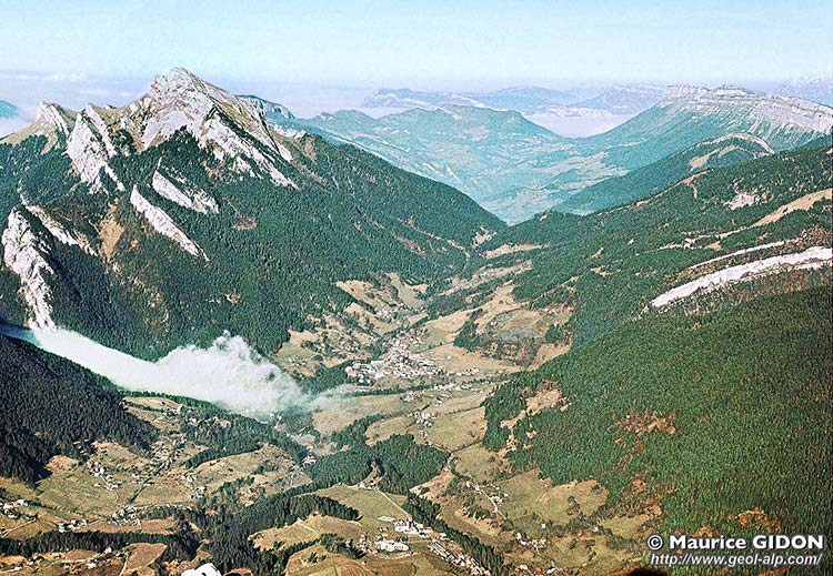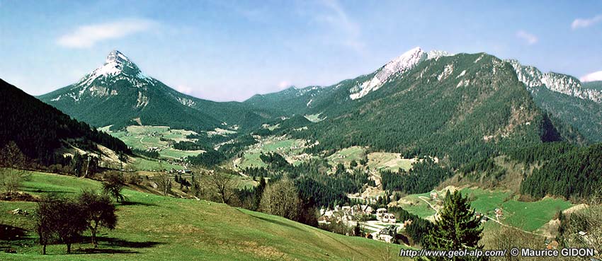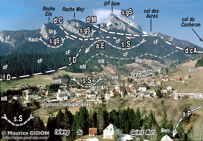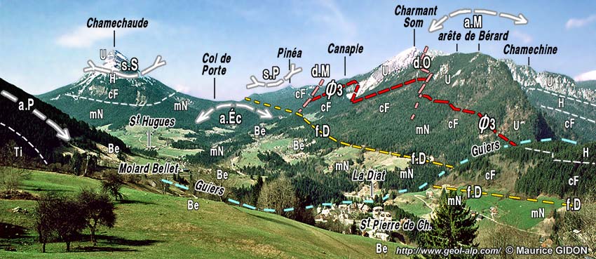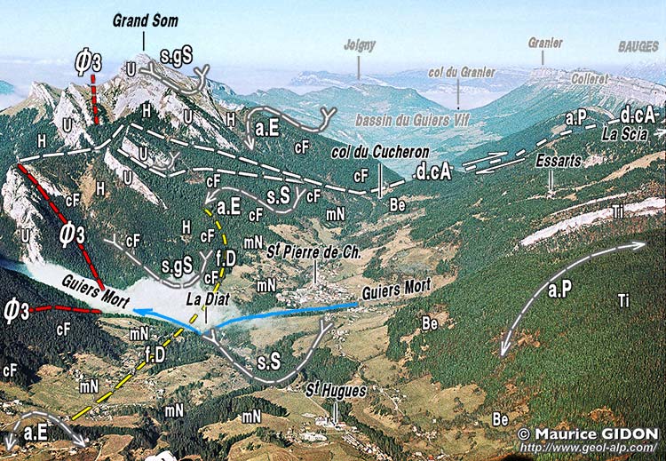 ![]() Le versant occidental de la Scia et le débouché de la cluse de Perquelin, vus du sud-ouest, depuis les pentes de Morinas. a.P = anticlinal de Perquelin ; ØS = chevauchement de la Scia (il est masqué au nord des Essarts par un éboulement ancien provenant de la falaise tithonique supérieure de la montagne) ; s.S = synclinal du Sappey Le replat de prairies de Saint-Hugues, de Gontière et de Saint-Pierre-de-Chartreuse représente le sommet du colmatage de la dépression ouverte dans les marnes de Narbonne du synclinal du Sappey lors du maximum de la glaciation de Würm. |