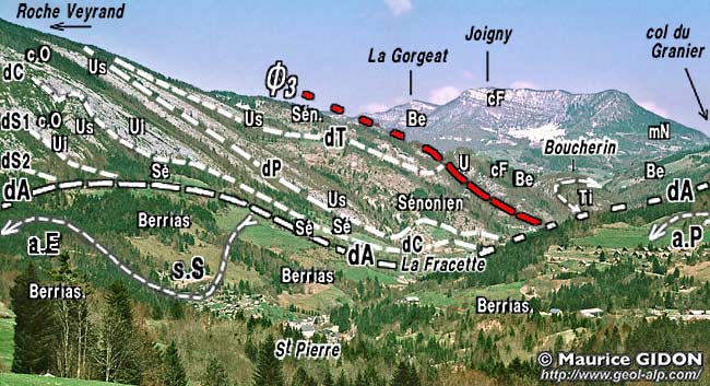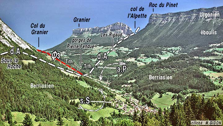 ![]() Croquis tectonique perspectif du secteur de Saint-Pierre-d'Entremont - La Fracette AE = anticlinal de l'Écoutoux ; Ss = synclinal du Sappey ; AP = anticlinal de Perquelin ; DA = décrochement de l'Alpette ; Ø3 = chevauchement de la Chartreuse orientale. Sur ce schéma on a délibérément omis de représenter les multiples accidents secondaires, pour ne donner qu'une vue simplifiée des traits majeurs de la structure. |