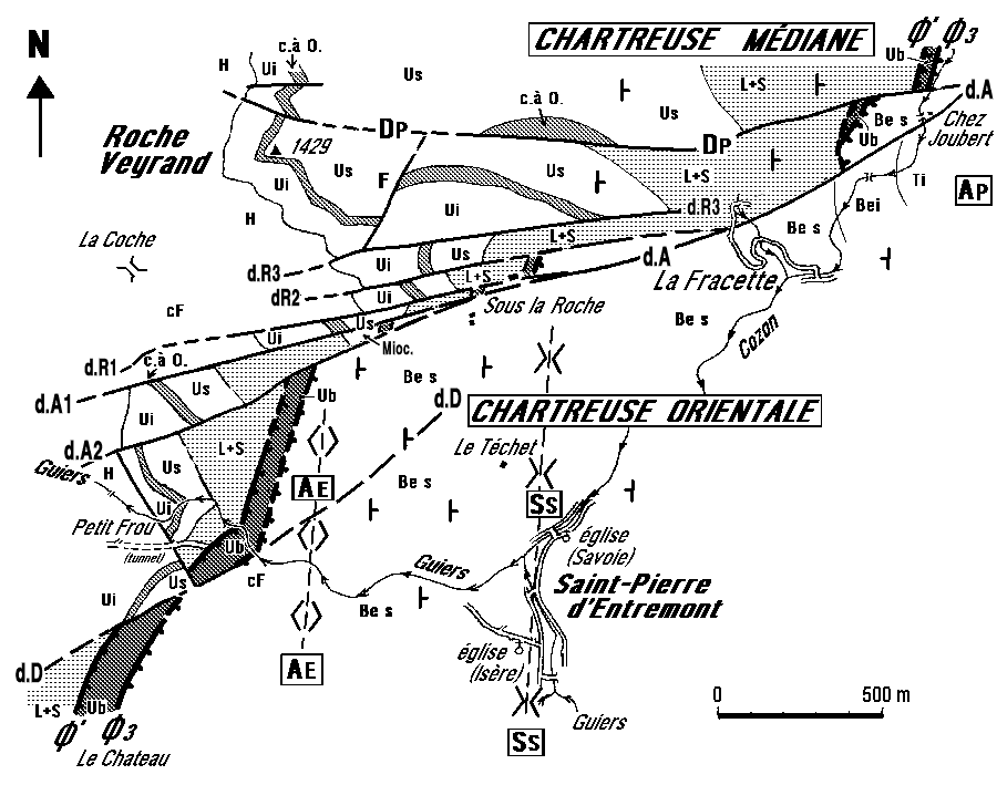 ![]() Carte structurale des pentes de rive droite du Cozon entre Saint-Pierre-d'Entremont et la Roche Veyrand. Le détail des affleurements n'est pas représenté, afin de mieux faire ressortir la disposition cartographique des principaux accidents. A titre de repères permettant d'apprécier le décalage introduit par chacune des fractures on a marqué d'un figuré grisé soutenu le niveau des couches à Orbitolines et d'un grisé plus léger l'ensemble des couches ("L+S") plus récentes que le sommet de l'Urgonien. Enfin la lame d'Urgonien broyé (Ub) marquant le flanc inverse étiré du pli-faille frontal de la Chartreuse orientale est figurée par un grisé très sombre. On remarquera la manière dont les failles de décrochement secondaires apparaissent à tour de rôle d'est en ouest, en se branchant sur la faille principale d.A. Cette dernière finit par se subdiviser à son tour en 2 branches (d.A1 et d.A2), là où l'essentiel du déplacement se trouve transféré, en utilisant sans doute en grande partie la surface même de chevauchement (Ø3), à la faille du Pas Dinay (d.D), qui devient à ce niveau la faille de décrochement principale. DP = branche de décrochement du Pin ; d.R3 , d.R2 et d.R1 = les trois branches de décrochement de Sous La Roche. |