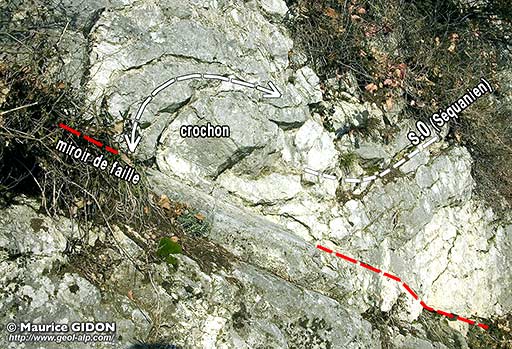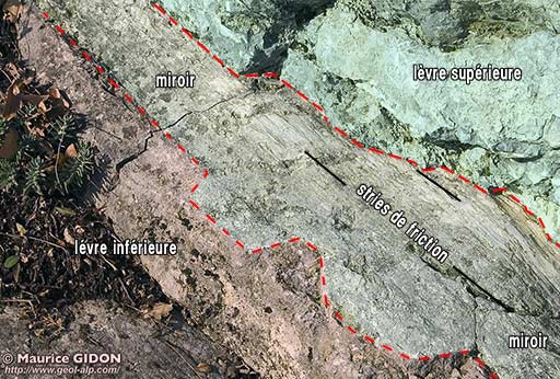 Ici le miroir de faille surplombe localement une poche de mylonite, qui représente en quelque sorte une navette écrasée.
