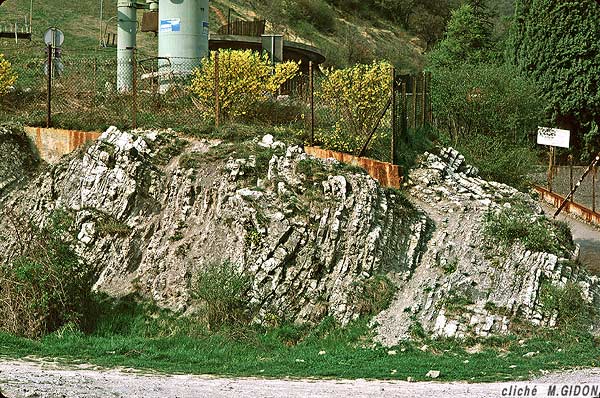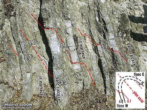 D'autre part, le long de cet itinéraire ou à ses abords, on voit aussi des plis (qui ne sont d'ailleurs souvent que de simples ondulations, sans inversion du sens de pendage d'un flanc à l'autre). Ils sont rapportables à deux familles, en fonction de l'orientation relative de leurs flancs courts et longs : quelques uns ont un dessin en S (ils sont comparables à celui de la plateforme de la Bastille) ; la plupart ont un dessin en Z (ils appartiennent à la famille de microplis associés à la formation de l'anticlinal de l'Écoutoux ; cf schéma à la page "Jalla").