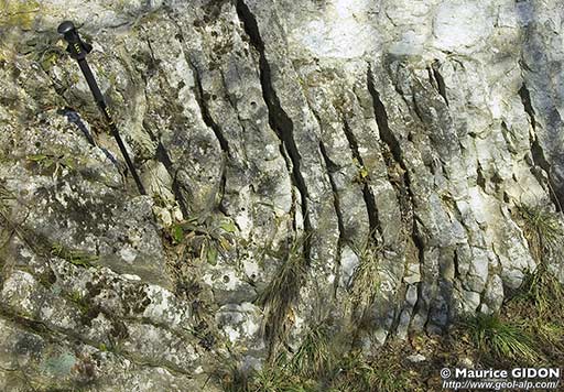 Un pli dans le Séquanien, au dessus des remparts supérieurs (sentier partant vers l'ouest au dessus de la première volée de marches de l'escalier du mur oriental des remparts). La canne de marche est plantée de façon à matérialiser l'axe du pli : il est fortement plongeant vers le nord (vers l'intérieur de la montagne), comme pour tous les autres de ce secteur, et comme pour l'anticlinal de l'Écoutoux, dont ils ne sont que des plis parasites. |