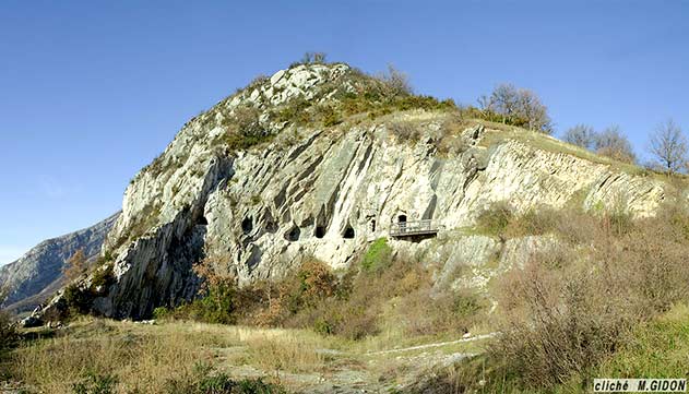 Cette plateforme a été aménagée du côté septentrional par creusement dans les couches du Kimméridgien inférieur (calcaires argileux en petits bancs séparés par des lits de marnes) puis dans celles de la transition Kimméridgien-Tithonique (bancs calcaires métriques à minces lits marneux). Ces dernières sont percés d'une galerie sous roche ouverte de fenêtres successives (dénommée "grottes de Mandrin"). Toutes ces couches, qui appartiennent au flanc occidental de l'anticlinal de l'Écoutoux, ont ici un pendage presque vertical.