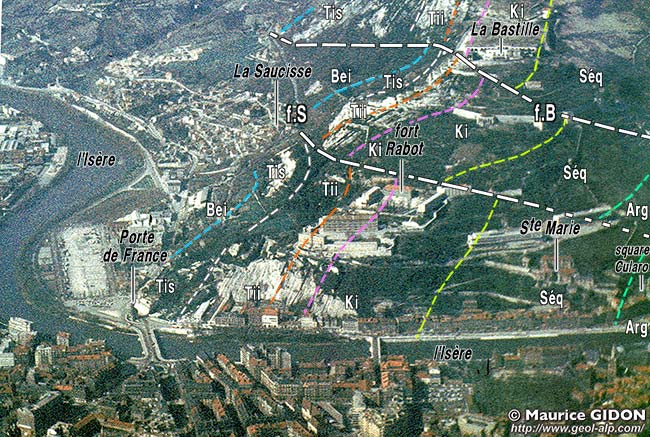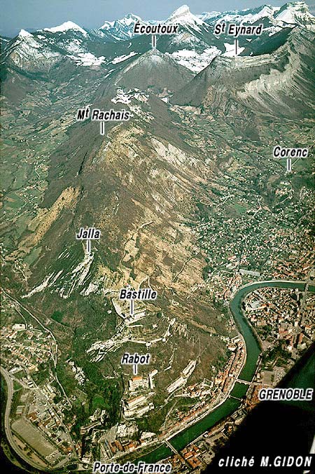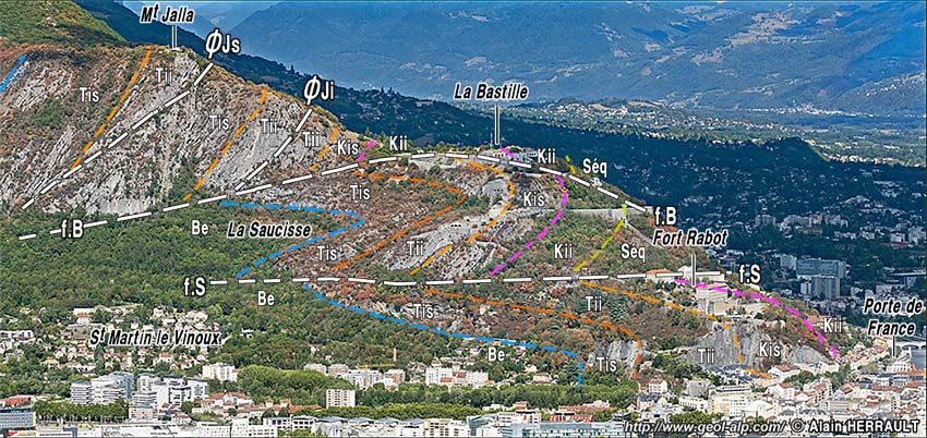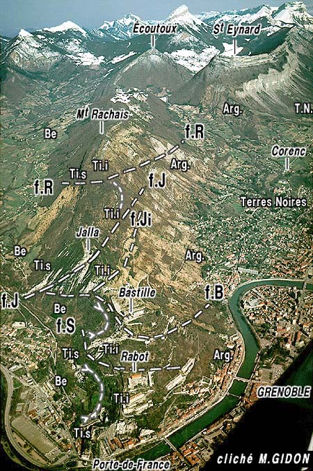 vu d'enfilade, du sud, d'avion, depuis l'aplomb du centre-ville de Grenoble. Les pentes de droite, plus douces et plus vertes, qui montent jusqu'au col de Vence, sont installées sur les marnes (Terres Noires) du coeur de l'anticlinal de l'Écoutoux. f.R = faille du Rachais ; f.J = failles du Jalla (f.Ji = chevauchement inférieur) ; f.B = faille de la Bastille ; f.S = faille de la Saucisse. (noter que f.B recoupe visiblement f.Ji, et sans doute f.J). On a représenté en outre les deux ondulations synclinales de La Saucisse et du fort Rabot. |
