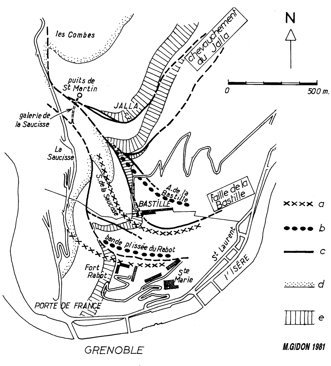 rocheux Bastille-Jalla a : traces des plans axiaux des plis synclinaux ; b : traces des plans axiaux des plis anticlinaux; c : trace des plans de cassure des failles longitudinales et transversales. d : limite inférieure des couches berriasiennes; e : calcaires massifs de la barre inférieure tithonique (d'âge Kimméridgien supérieur). |