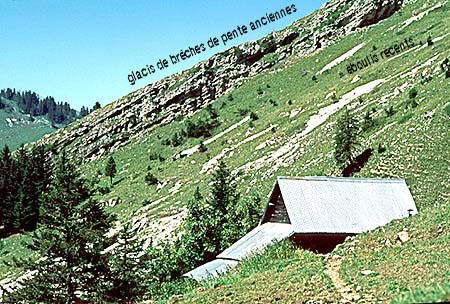En rive droite du vallon de Bellefond la régularité de la raide pente d'alpage qui monte régulièrement jusqu'au pied de la falaise occidentale de la Lance sud de Malissard a une origine particulière : c'est un glacis d'éboulis anciens. Ceci est clairement visible dans le versant plus raide de la rive droite du vallon, qui en donne coupe naturelle orthogonale à ce glacis : on voit qu'il s'agit de couches disposées parallèlement à la surface du glacis, qui sont capricieusement cimentés en "brèches de pentes". Elles sont clairement distinctes des éboulis de formation récente que le sentier traverse pour franchir le creux du vallon avant d'arriver au chalet de Bellefond.