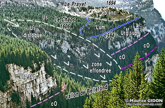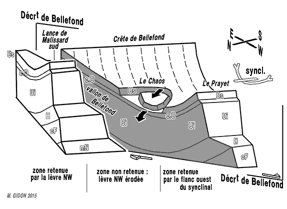 ![]() Schéma perspectif interprétatif syncl. = disposition de l'axe du synclinal chartreux oriental (légèrement plongeant vers le nord). Le grisé correspond à la surface de la lèvre SE de la faille du décrochement de Bellefond et aux limites de l'Urgonien supérieur arraché (dont la partie aval s'est éboulée dans le ravin de Bellefond). |
