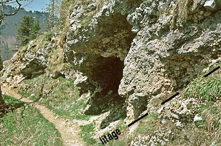 Ces éboulis cimentés sont même creusés d'une grotte, qui ne résulte sans doute pas de l'action de circulations souterraines mais simplement de l'effritement d'une zone moins bien cimentée de la brèche.