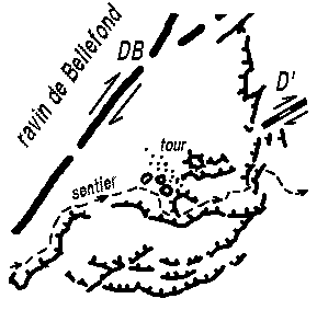 Plan approximatif du chaos (à gauche) et vue zénithale (à droite). Les crevasses, dirigées par des fissures de directions variées, s'organisent pour découper des tranches en croissant de lune à concavité vers le nord-ouest. Le monolithe principal est ici désigné du nom de "tour" DB = tracé du décrochement de Bellefond (en pied des falaises qui supportent le chaos) |
