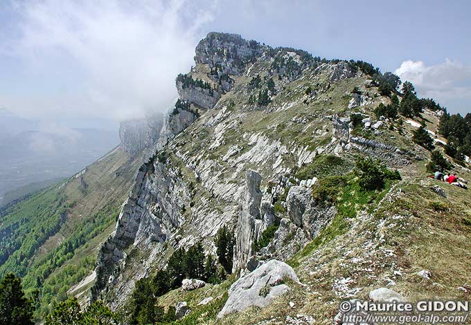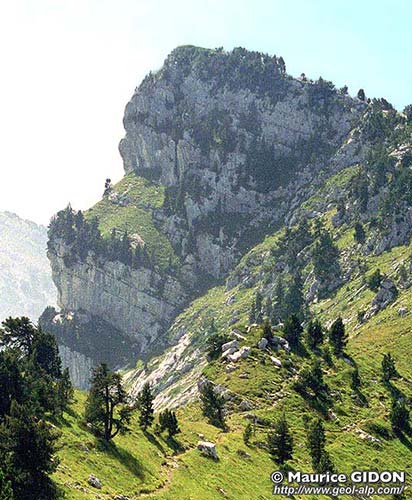 ![]() Dièdre formé par deux failles normales conjuguées* Partie supérieure de la masse urgonienne inférieure, rebord sud du plateau du Prayet au nord de la Dent de Crolles (falaise s'élevant vers la droite jusqu'à la cheminée du Paradis). Le compartiment surélevé compris entre
