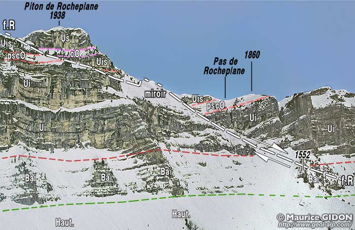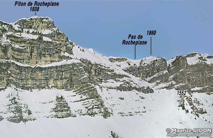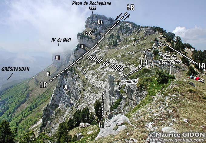 Le sommet du Piton de Rocheplane (point coté 1938) est la partie respectée par l'érosion de la lèvre supérieure (abaissée) de la faille, au sud du Pas de Rocheplane. La destinée de ce prisme rocheux est assez clairement de s'effondrer du côté du Grésivaudan en suivant le prédécoupage de la surface de faille, comme l'a fait la partie de la crête située entre lui et le Pas.