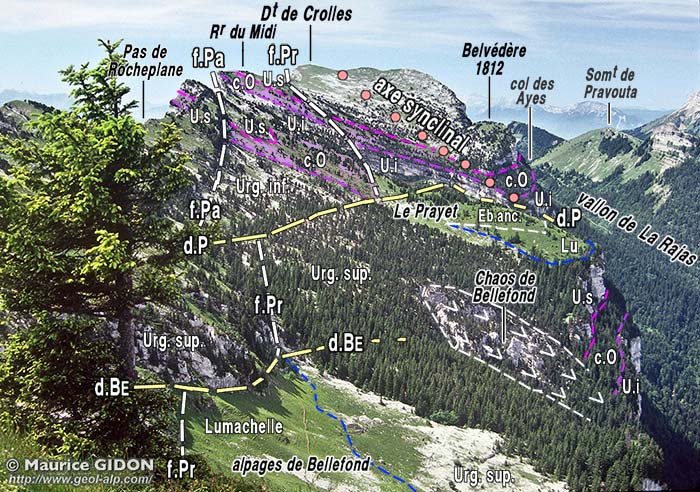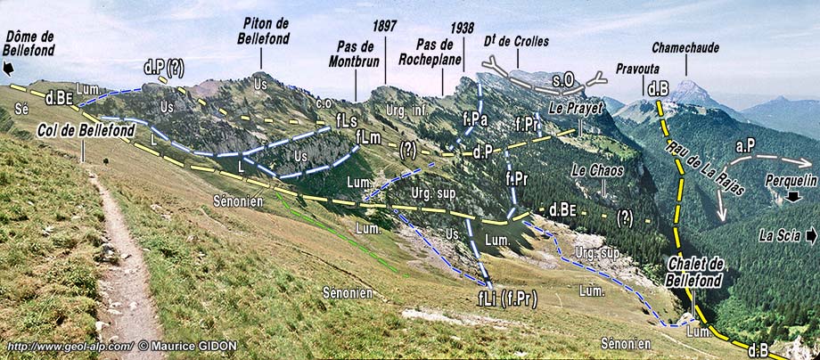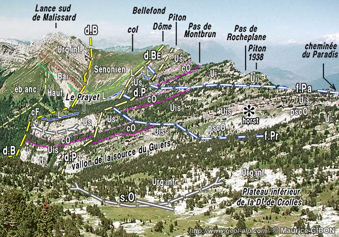![]() La crête de Bellefond, ensemble du versant ouest, vu du nord depuis le col de Bellefond. d.B = décrochement principal, de Bellefond (il passe à droite de l'observateur, dans la ravine du pied méridional de la Lance sud de Malissard) ; d.BE = décrochement oriental de Bellefond, satellite limitant vers le SE les affleurements de Sénonien (et donc les alpages les plus herbeux) ; d.P = décrochement satellite, plus méridional, du Prayet. FL = Failles N-S subverticales, longitudinales par rapport à l'axe du synclinal chartreux oriental, toutes ici à rejet d'abaissement du compartiment ouest (droit) ; sur le cliché photo ont été distinguées : fLs, fLm, fLi = faisceau des failles des alpages de Bellefond ; f.Pa = faille longitudinale du Paradis ; f.Pr = faille longitudinale du Prayet. |