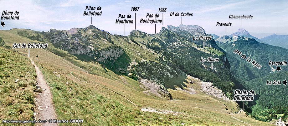 Le point le plus bas de la crête de Bellefond est le Pas de Rocheplane (1860 m). Le sentier qui l'atteint par le versant oriental, depuis les Petites Roches, s'élève dans son trajet final sur une dalle structurale*, inclinée à 40° vers l'est. Il s'avère que celle-ci résulte du dégagement par l'érosion d'un miroir de faille.