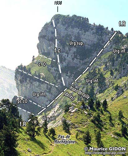 image sensible au survol et au clic Le Pas et le piton de Rocheplane La faille verticale f.c est une faille conjuguée de f.R (son rejet est symétrique) mais cette dernière la décale. Elle se raccorde plus au sud (voir carte) à la faille du Paradis FPa (mais n'en est qu'une branche secondaire). Noter que la bissectrice de l'angle f.c / f.R (qui correspond à Z = axe du raccourcissement) est perpendiculaire aux couches : ceci suggère que ces failles ont affecté les couches alors qu'elles étaient horizontales, puis ont basculé avec elles lors du plissement. La vire notée ps.cO correspond aux "pseudo-couches à Orbitolines", niveau à lits calcaréo-argileux situé une trentaine de mètres plus bas, dans la partie haute de l'Urgonien inférieur (elle est figurée par un ruban grisé sur la carte géologique). |