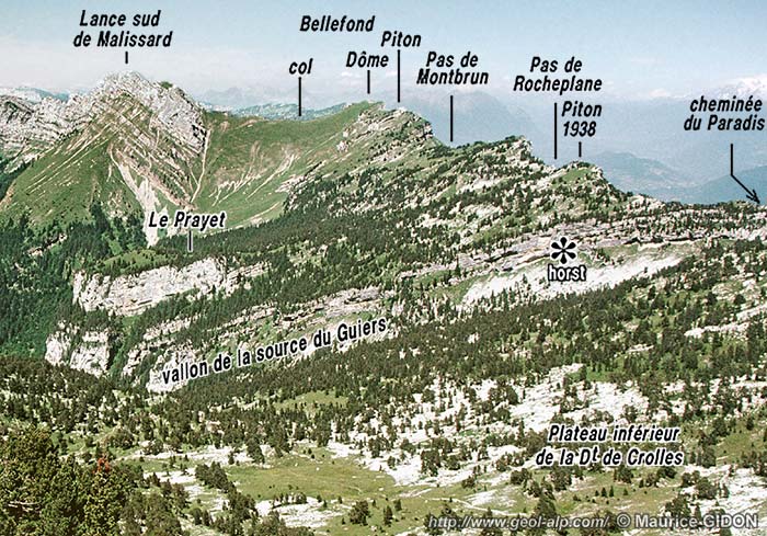 L'assemblage en un "horst" de deux petites failles mineures, appartenant à ces familles conjuguées, s'observe en modèle réduit dans la falaise qui constitue le rebord méridional du plateau du Prayet et que le sentier GR franchit en encorbellement pour s'engager dans le haut vallonnement de la source du Guiers (repérage par un astérisque sur le cliché ci-dessus).