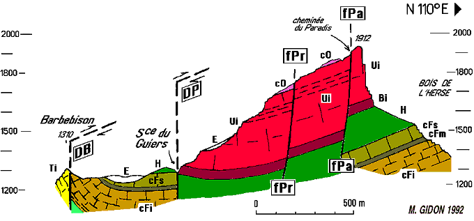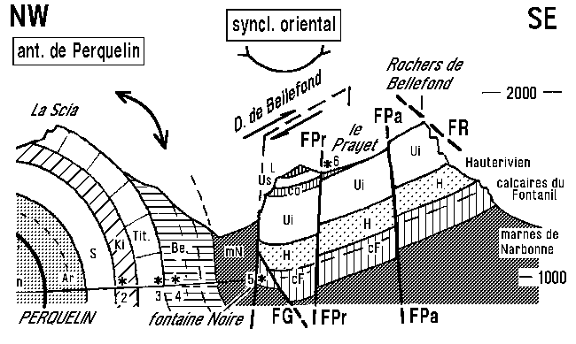 ![]() Coupe au travers des crêtes de Bellefond, au niveau du Prayet. Selon le tracé de cette coupe le décrochement de Bellefond, qui longe le pied des falaises occidentales chaînon, a pour effet de ramener le flanc est du synclinal oriental au contact direct du flanc est de l'anticlinal de Perquelin, escamotant pratiquement ainsi le fond du synclinal. Les 4 failles, désignées par les notations abrégées ci-après, sont des cassures longitudinales, N-S : FG = faille de la Gorgette; FPr = faille du Prayet ; FPa = faille du Paradis; FR = faille de Rocheplane. |