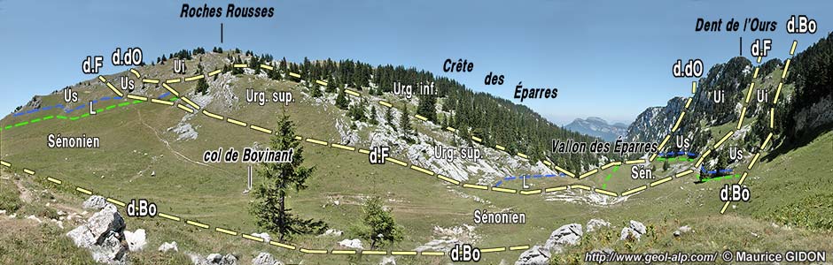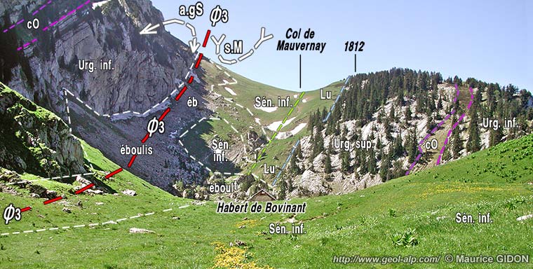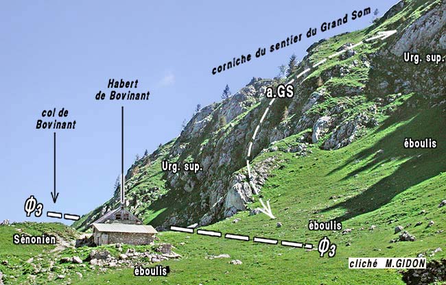 Néanmoins il reste que, depuis le chalet de Bovinant au sud jusqu'au village du Château du Gouvernement au nord, ce chevauchement n'est réellement observable en aucun point. En outre son rejet doit être ici relativement réduit, puisqu'aux abords nord du col de Bovinant il semble passer simplement au sein du Sénonien en se contentant de rompre le flanc est du synclinal de Mauvernay - Bovinant (voir clichés ci-après) ... |