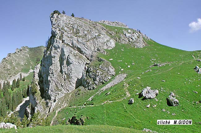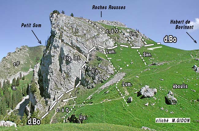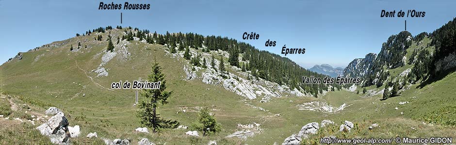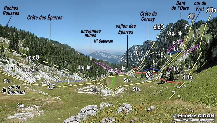 A proximité du col de Bovinant le sillon s'ouvre assez largement et se garnit d'alpages, ce qui permet d'examiner beaucoup mieux son contenu. Encore que ses abrupts orientaux soient frangés à leur pied, de façon presque continue, par une courte jupe d'éboulis on peut y analyser en détail les multiples complications tectoniques qui les affectent.