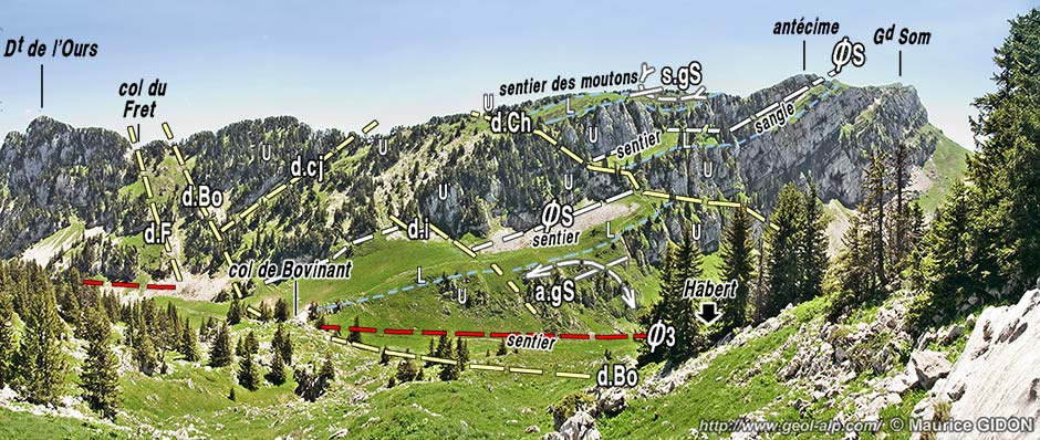 Mais sur les deux versants l'examen des marges de la bande de prairies montre qu'elle est traversée par un faisceau de failles de décrochement* qui, du sud vers le nord, en décale progressivement les tronçons vers l'est (donc dans le sens dextre). La plus méridionale et la plus importante des cassures de ce faisceau est désignée comme décrochement de Bovinant car c'est elle qui détermine l'abrupt transverse qui tranche l'Urgonien du flanc ouest du synclinal à la latitude du habert de Bovinant.