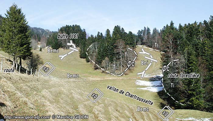 À l'ouest du vallon du Couvent les pentes boisées de rive droite du Guiers sont affectées par l'échine de La Fitole qui est armée par le cœur tithonique de l'anticlinal médian. Vers l'altitude de 1100 mètres ces pentes présentent un secteur moins déclive, où se situent les haberts (= chalets) des Rochers et de Chartroussette. À ce niveau elles sont traversées en courbe de niveau par une route forestière (en cul de sac) qui provient du Couvent : cette route donne une coupe très accessible qui est assez représentative de la structure de ce versant.