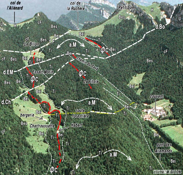 ![]() Détails structuraux de la combe de Chartroussette et de l'échine de la Fitole ØC = chevauchement de Chartroussette ; a.M = anticlinal médian (sur toute sa longueur il est affecté par une ondulation synclinale et son flanc ouest est rebroussé vers le bas par un crochon anticlinal plus ou moins accentué ; d.EM = décrochement de l'Essart Morin ; d.Ch = décrochement de Chartroussette. (voir en fin de page la carte détaillée du secteur représenté sur ce cliché). |