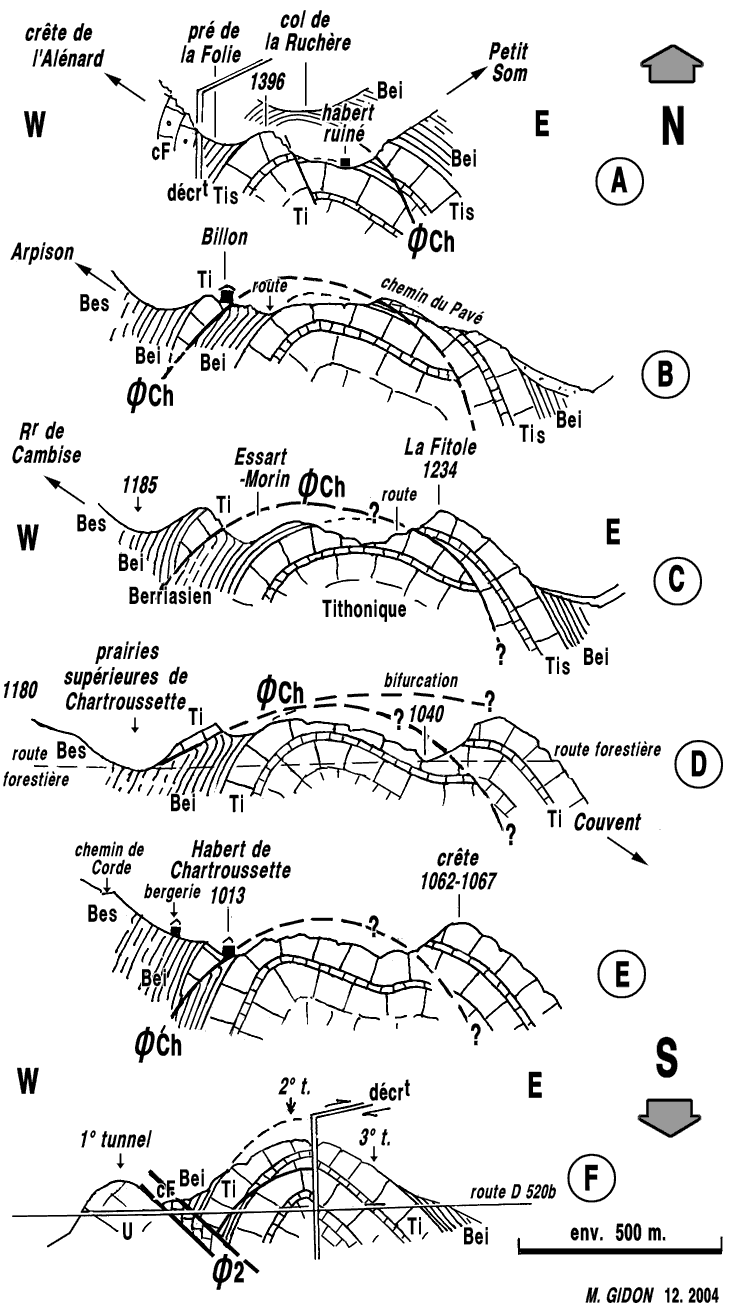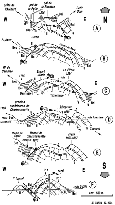 Coupes sériées au travers de l'anticlinal médian en rive droite du Guiers Mort, depuis le col de la Ruchère, au nord, jusqu'à la gorge du Guiers Mort, au sud. ØCh = chevauchement de Chartroussette Au sud de Billon l'endroit exact où passe le chevauchement de Chartroussette, dans le flanc oriental de l'anticlinal médian n'est pas déterminé avec certitude car il n'est plus souligné par une lame de Berriasien et met en contact Tithonique sur Tithonique. L'interprétation de la coupe F, fournie par la route D 520b dans sa traversée des "trois tunnels" est vraisemblable mais un peu hypothétique (et donc provisoire). En effet les affleurements de Berriasien représentés comme coincés sous le chevauchement de Chartroussette sont de taille à peine pluri-métrique et leur attribution au Berriasien n'est encore étayée que sur leur faciès. |