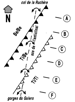 Schéma cartographique théorique Selon l'endroit, plus ou moins septentrional, où l'on se trouve sur l'axe de l'anticlinal médian on pourra observer, ou non la présence d'une lame de Tithonique chevauchante et/ou celle d'une lame de Berriasien chevauché. Ti/Ti = chevauchement faisant reposer du Tithonique