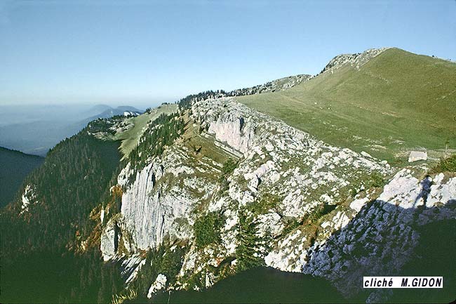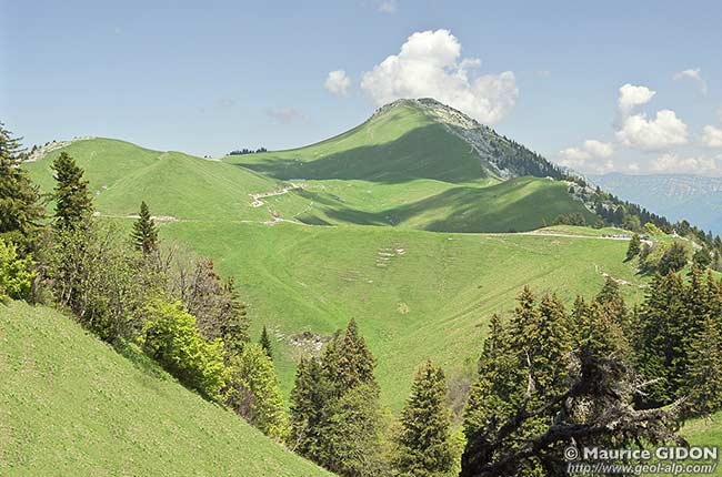 La crête que rejoint le sentier d'accès au sommet correspond à la voûte du repli anticlinal du Charmant Som. Il s'abaisse très visiblement vers le sud, comme le creux du vallon d'alpages, qui correspond lui au repli synclinal des haberts. |