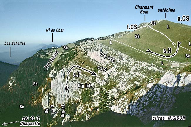 ![]() Les alpages septentrionaux et le versant ouest du Charmant Som, vus du sud-ouest, depuis les abords occidentaux des haberts . f.GP = faille du Grand Poyat ; a.F = anticlinal du Fournel ; s.H = synclinal des Haberts ; a.CS = voûte de l'anticlinal du Charmant Som ; f.CS = faille du Charmant Som. |