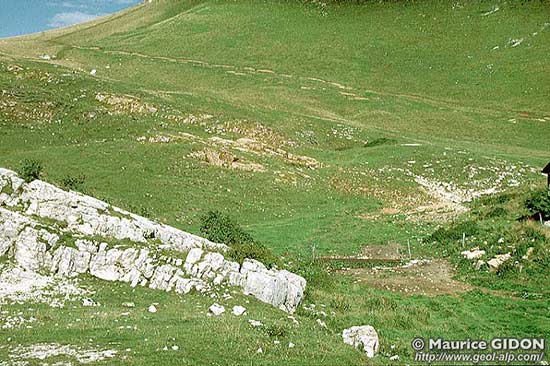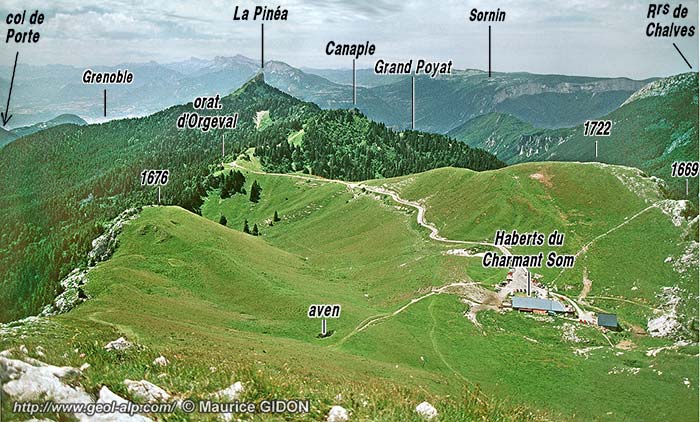 La voûte anticlinale du mont jurassien* qui forme le sommet du Charmant Som (voir page Charmant Som) plonge vers le sud de sorte que la carapace urgonienne tend à s'y enfoncer sous les terrains argilo-calcaires, plus tendres, du Crétacé supérieur. Ces derniers y sont le support du développement de beaux alpages, que crèvent de ci de là des petits avens (de diamètre décamétrique) qui correspondent aux entrées supérieures de gouffres développés dans l’Urgonien sous-jacent et qui sont obturés par des blocs éboulés.
