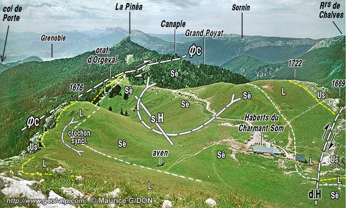 ![]() La partie méridionale des alpages du Charmant Som, vue du nord, depuis la bosse la plus méridionale de l'antécime sud. ØC = chevauchement de Canaple ; .s.H = synclinal des Haberts (il est rebroussé du côté gauche par le crochon d'entraînement dû au chevauchement de Canaple) ; d.H = décrochement dextre des Haberts. Les tirets jaunes soulignent la limite Urgonien - Lumachelle. Les alpages occupent un "val"*, au sens jurassien du mot, mais celui-ci n'a pas évidé par l'érosion de façon régulière. (autres commentaires sur le croquis de la page "panoramas"). |