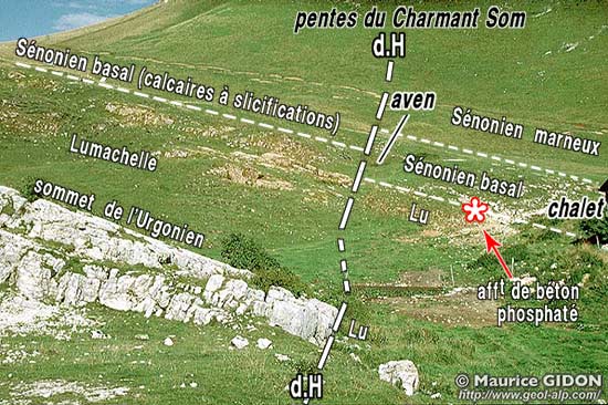 ![]() Détails de la partie septentrionale des alpages du Charmant Som, vus de l'ouest depuis le piton 1669, à l'ouest des haberts du Charmant Som. s.H = synclinal des Haberts (noter le plongement axial vers le sud : les affleurements de Sénonien du coeur du synclinal s'élargissent en direction du sud, surtout à partir des chalets) ; f.CS = faille N-S du Charmant Som (voir la page Chamechine) ; d.H = décrochement dextre des Haberts. Sé ci = Sénonien basal (20 m de calcaires à silicifications) ; Sé mc = Sénonien inférieur (marno-calcaires friables) (voir, pour plus de détails concernant le sommet de l'antécime sud, la page "antécime sud du Charmant Som"). |