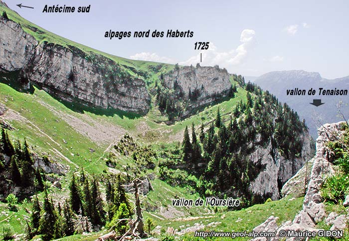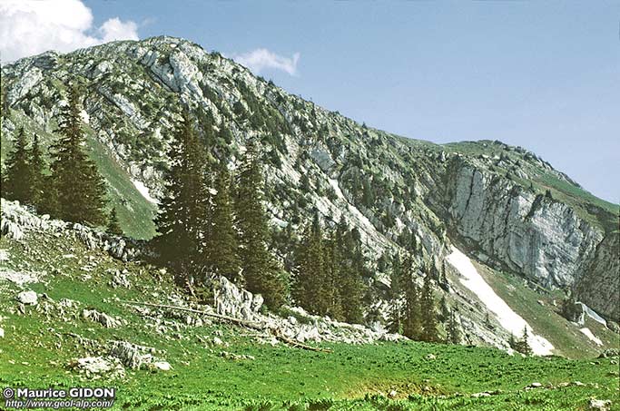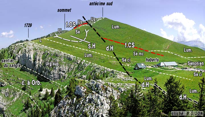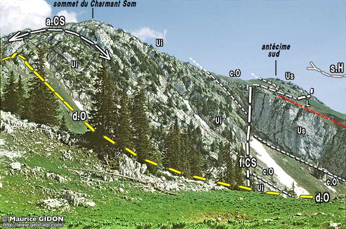 Du fait de cette disposition générale les alpages du Charmant Som sont limité vers le nord par des escarpements rocheux urgoniens ; à la faveur de ces derniers on s'aperçoit que la voûte de l'anticlinal médian y est affectée de complications tectoniques de détail.