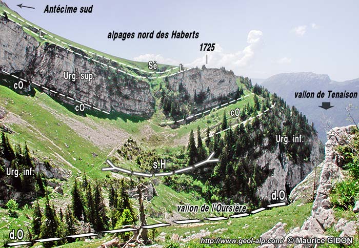 ![]() Le versant ouest de l'antécime du Charmant Som, vu de l'ouest depuis le piton 1669, à l'ouest des haberts du Charmant Som.s.H = synclinal des Haberts (noter son plongement axial vers le sud. f.CS = faille N-S du Charmant Som (voir aussi la page "Chamechine") ; d.H = décrochement dextre des Haberts. Sé ci = Sénonien basal (20 m de calcaires à silicifications) ; Sé mc = Sénonien inférieur (marno-calcaires friables). |