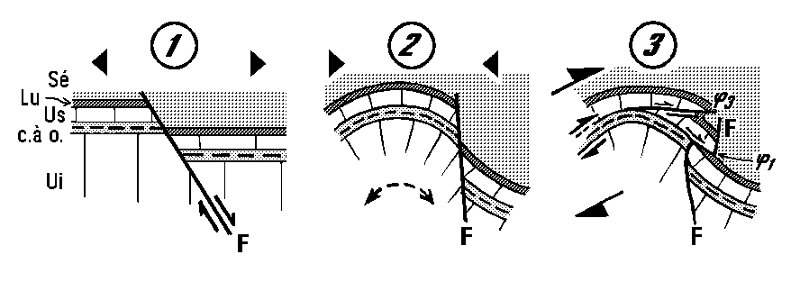 ![]() Schéma interprétatif de la formation du dispositif actuel (l'ouest est à droite, comme sur le cliché précédent) 1 = jeu extensif de la faille du Charmant Som (F), au Crétacé ou à l'Oligocène (??) ; 2 = étape du plissement, basculant le plan de faille ; 3 = étape d'entraînement de l'Urgonien supérieur, sous le chevauchement de la Chartreuse orientale : ce mouvement se produit à la faveur de glissements couches sur couches au niveau des couches à Orbitolines (Ø1) et de quelques cassures inverses secondaires (Ø3) dans l'Urgonien supérieur. Le tronçon supérieur de F est littéralement transporté vers l'ouest d'une trentaine de mètres. NB : c'est ce mouvement d'entraînement vers l'ouest qui est également à l'origine, au sud du Charmant Som, de la formation de l'écaille de Canaple. |