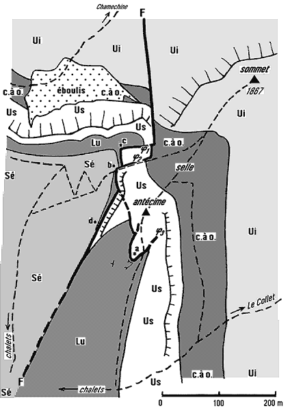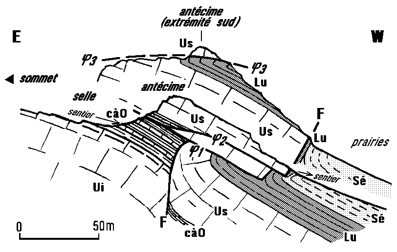 ![]() Coupes de détail donnant une vue synthétique de la structure de l'antécime sud du Charmant Som La coupe inférieure correspond à la moitié droite du cliché ci-après. L'orientation est inverse de celle de la coupe d'ensemble donnée plus haut. F = faille N-S du Charmant Som ; Ø1, Ø2, Ø3: chevauchements presque parallèles aux surfaces de couches (légende complémentaire dans le texte). |