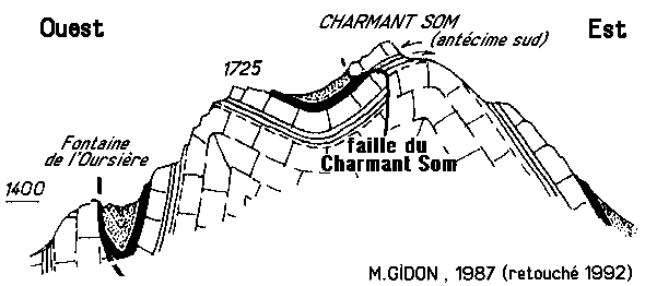 ![]() Coupe passant peu au sud du sommet du Charmant Som On voit sur cette coupe que l'anticlinal du Charmant Som est, accessoirement, rompu par une faille N-S, la "faille du Charmant Som". Cette faille est en outre tordue par le jeu de glissements couches sur couches dans les couches à Orbitolines et dans l'Urgonien supérieur de l'antécime sud (voir détails dans les figures ci-après). |