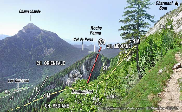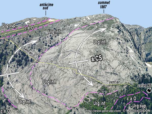 En remontant vers la crête en amont du tracé du chevauchement (par exemple par le sentier qui monte des Cottaves à l'oratoire d'Orgeval, en passant au sud de la Roche Penna) on voit affleurer successivement le Sénonien, la Lumachelle, l'Urgonien supérieur et enfin l'Urgonien inférieur, avec un pendage conforme à celui de la pente topographique mais un peu plus fort, de sorte que les couches les plus récentes affleurent en contrebas des plus anciennes (qu'elles recouvrent en succession stratigraphique normale). Toutefois leur pendage décroît vers le haut du fait de leur ploiement en anticlinal, de sorte qu'en se rapprochant de la crête ce sont des couches de plus en plus récentes qui affleurent, conservées à la voûte du pli dans les pentes de l'antécime sud.