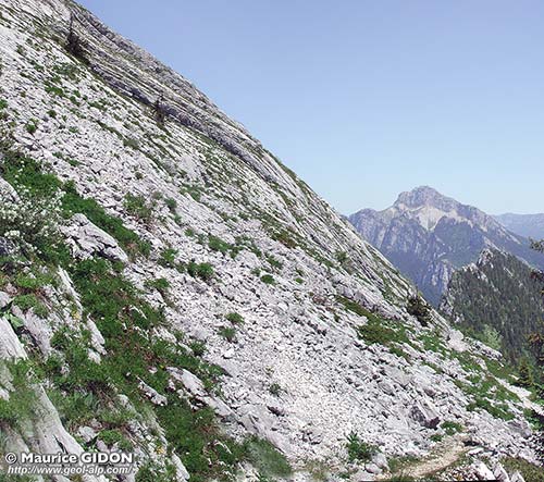 Vue rapprochée des dalles du versant est du Charmant Som, du sud, depuis le sentier qui les traverse. On est ici dans les couches sommitales de la masse urgonienne inférieure ; observer le petit abrupt en dévers qui correspond à l'arrachement d'une tranche de banc : celle-ci s'est disloquée en donnant les éboulis de premier plan. |