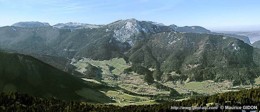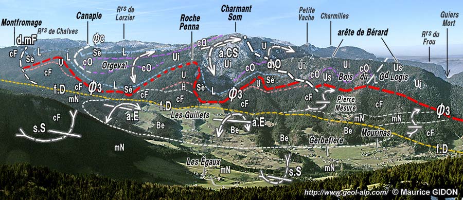 ![]() Le versant oriental du chaînon du Charmant Som, vu de l'est, depuis la Croix de Pravouta. d.mF = décrochement du Montfromage ; ØC = chevauchement de Canaple ; Ø3 = chevauchement de la Chartreuse orientale ; s.S = synclinal du Sappey ; a.E = anticlinal de l'Écoutoux ; a.CS = anticlinal du Charmant Som ; d.O = décrochement de l'Oursière, f.D = accident de la Diat (voir la page "Saint-Pierre-de-Chartreuse"). Le Bois du Grand Logis et l'arête de Bérard sont formés par la dalle urgonienne du flanc oriental de l'anticlinal du Charmant Som, dont la voûte est crevée par l'érosion à droite (au nord-ouest) du sommet du Charmant Som. |