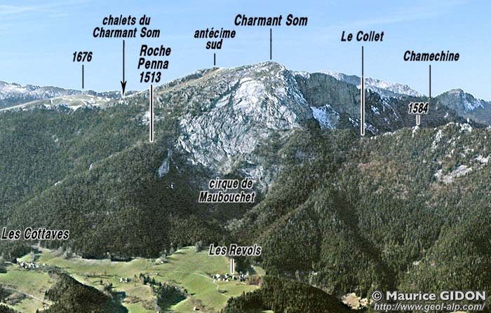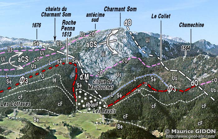 Dans le versant oriental du Charmant Som au dessus du village des Revols, vu du nord, au niveau de la vire des couches à Orbitolines. Ø3 = chevauchement de la Chartreuse orientale ; d.M = décrochement de Maubouchet. On a représenté dans leur position approximative (en tirets lâches) les limites des couches qui ferment du côté amont le cirque de Maubouchet mais sont masquées par la végétation de premier plan. |