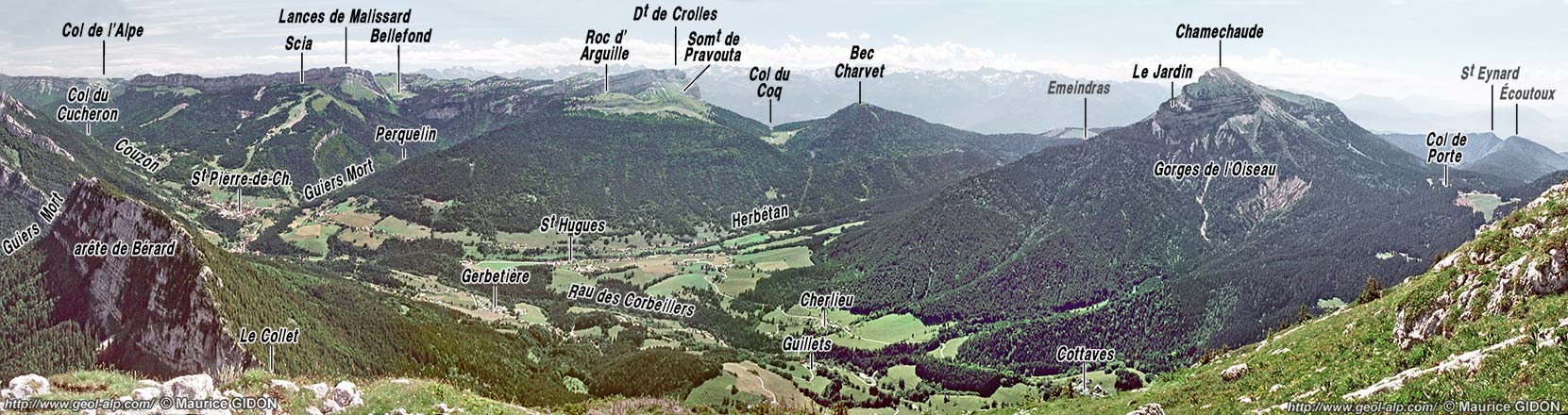 La moitié nord-orientale du panorama est par contre particulièrement bien dégagée. Par les coupes naturelles qu'elle dévoile, elle donne un remarquable résumé de la structure du massif de la Chartreuse.