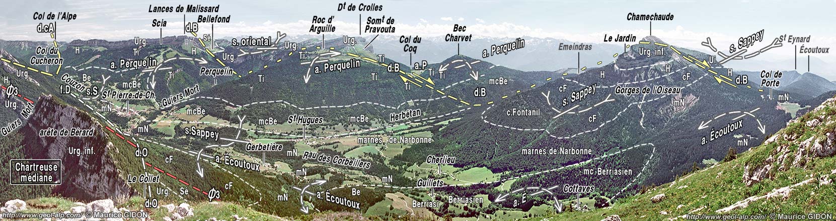![]() Panorama depuis le sommet du Charmant Som en direction de l'est et du Sud-est : la partie médiane de la dépression axiale de la Chartreuse orientale. Annotations structurales abrégées : Ø3 = chevauchement de la Chartreuse orientale ; d.CA = décrochement du col de l'Alpe ; d.B = décrochement de Bellefond ; f.D = faille de La Diat ; d.O = décrochement de l'Oursière. |