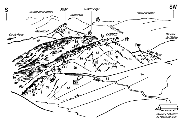 ![]() Suite du panorama vers le sud, dans l'axe du chaînon du Charmant Som, depuis l'antécime méridionale (autres commentaires sur le croquis ci-après) ![]() La voûte de l'anticlinal médian, accidentée par le repli synclinal des Haberts, s'enfonce vers le sud sous l'échine boisée de Canaple puis sous celle de la Pinéa. Ces deux échines correspondent chacune à une tranche de terrains amenée de la gauche vers la droite par chevauchement : ce sont les chevauchements imbriqués de l'"écaille de Canaple" (Øc), puis de la Chartreuse orientale (Ø3), qui traverse la crête en biais entre les sommets de Canaple et de La Pinéa. Le premier sans doute induit, par entraînement*, par le second. SH = synclinal des Haberts ; FGP = faille du Grand Poyat. à propos de cette vue : visiter les abords de Canaple et de la route sylvo-pastorale ; plus de détails sur la Pinéa |